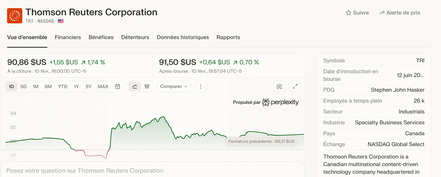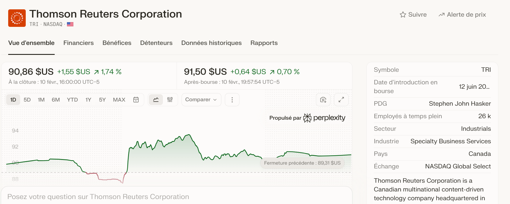 Allez sur perplexity.ai/finance et tapez “Thomson Reuters”. En 2 secondes : cours en temps réel, résultats trimestriels, marges, comparaison sectorielle